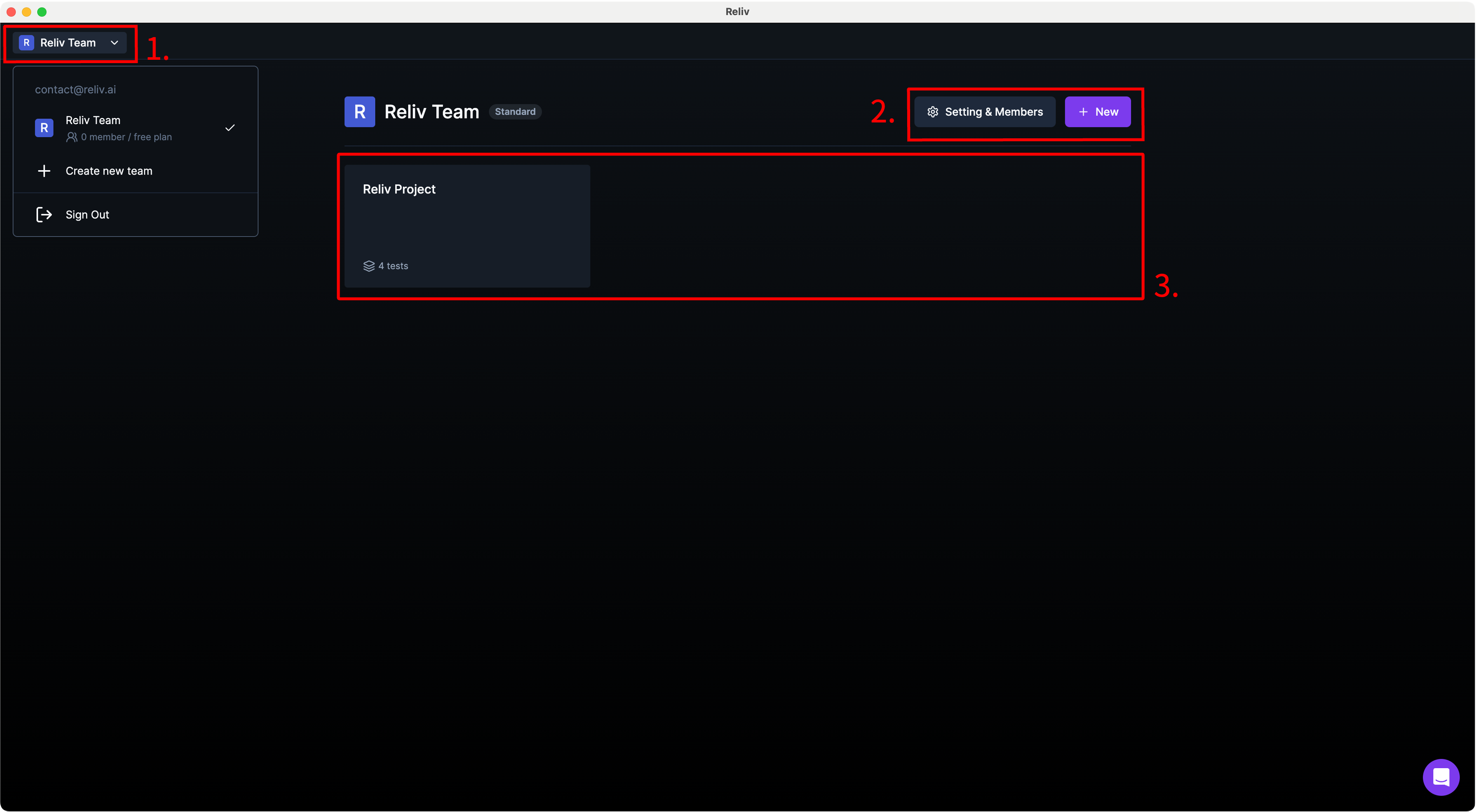 - [Setting & Members] leads to the team settings, and [New] button creates a new project.