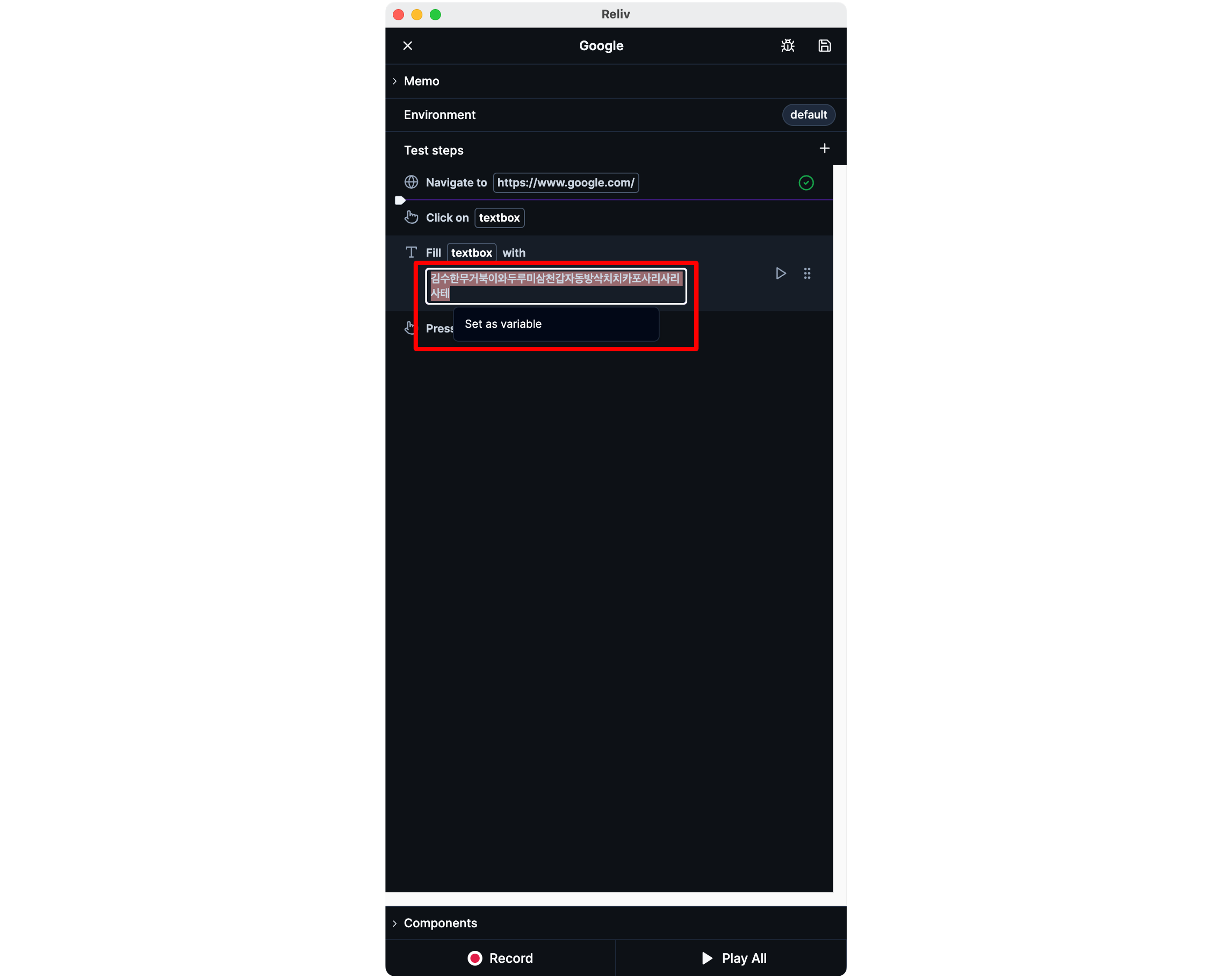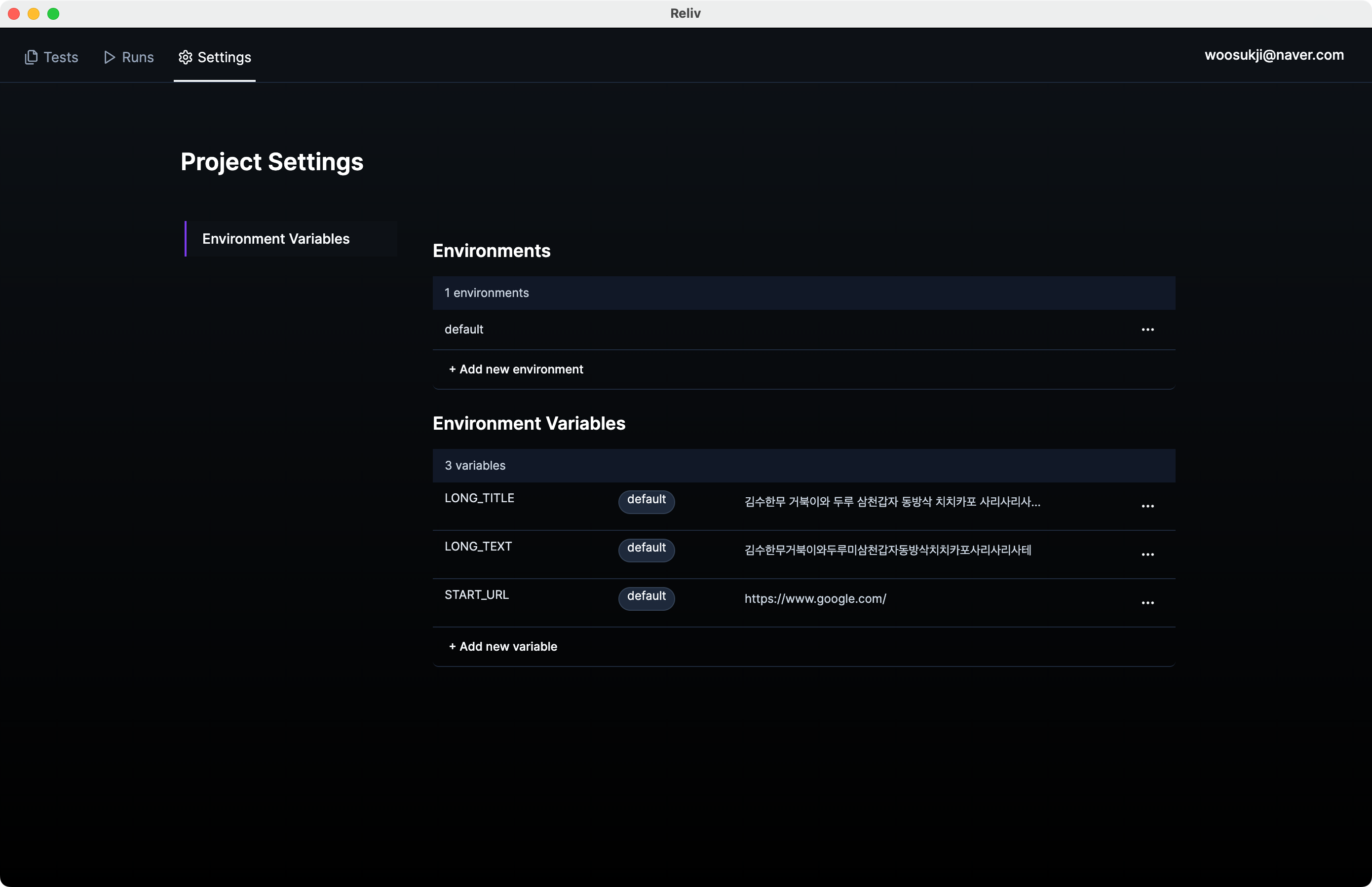 You can designate frequently used text as environment variables and use them by calling them into your tests. Unlike Variables, environment variables are shared across the entire project. They are suitable for values (such as URLs, account IDs, etc.) that need to vary according to the test execution environment (local/dev/prod, etc.).