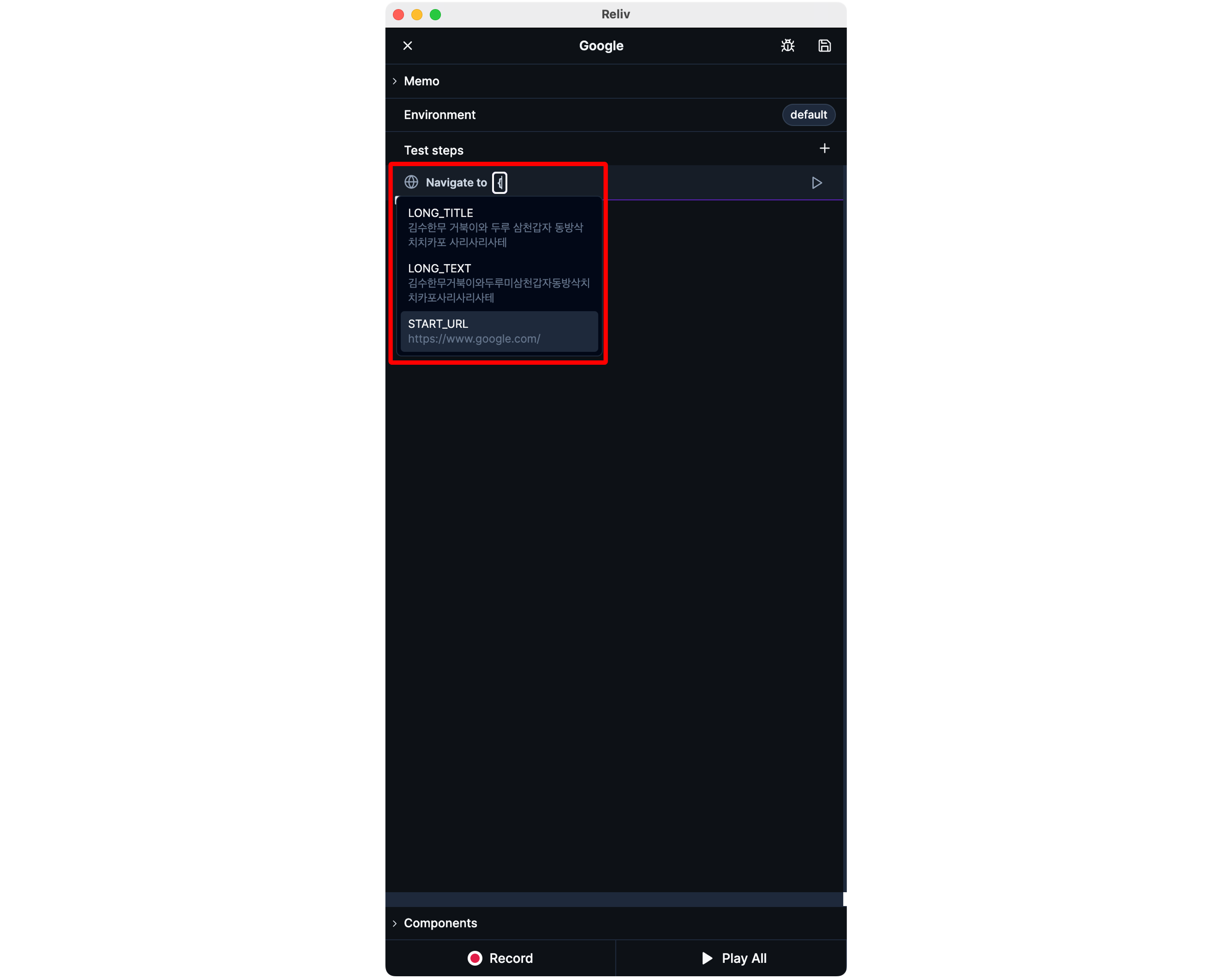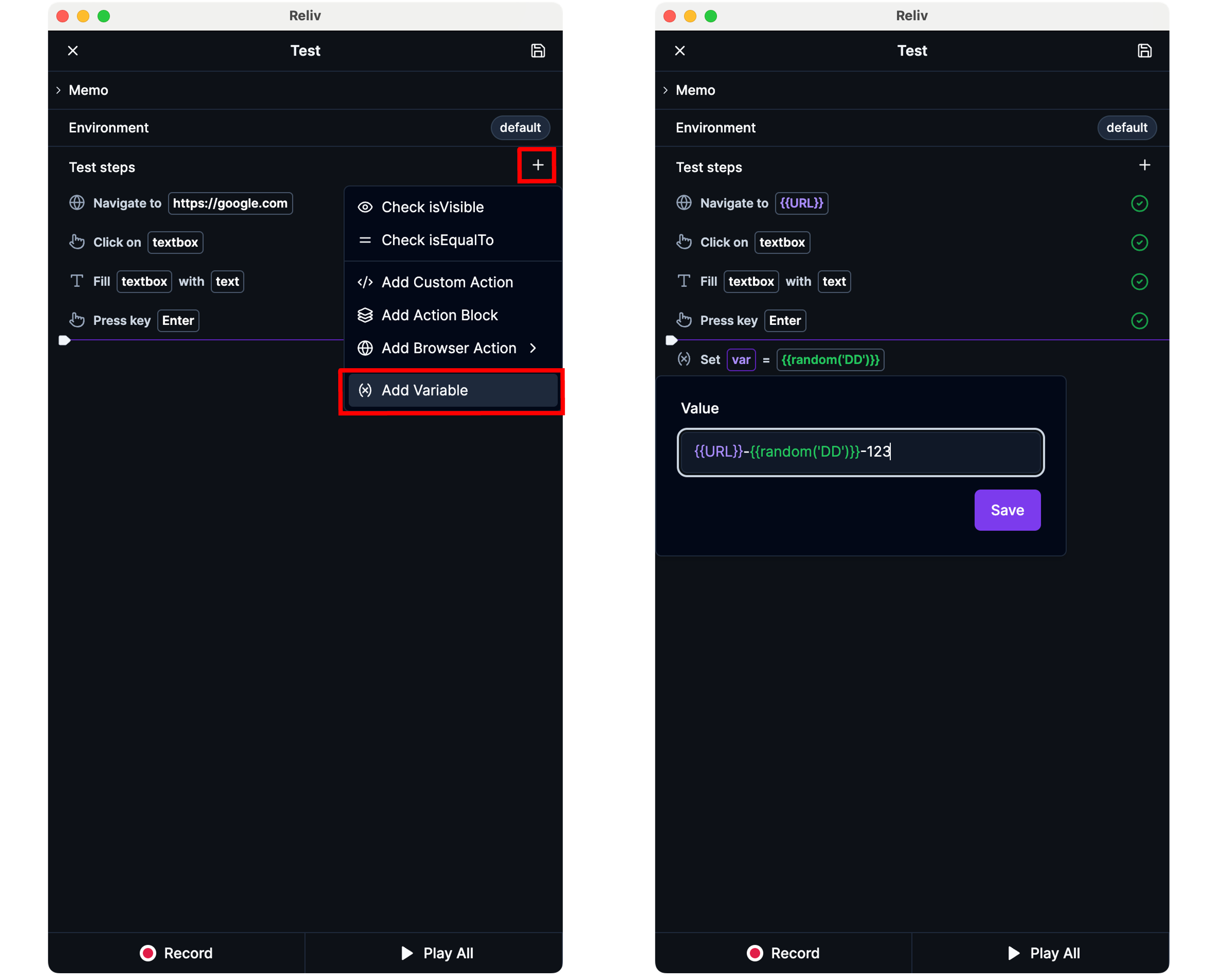 You can add a variable by clicking the [+] button at the top right of the [Test Steps] panel in the Reliv Editor and then clicking [Add Variable]. You can enter the desired variable value as text, or use various types of variables by typing{ (curly braces).